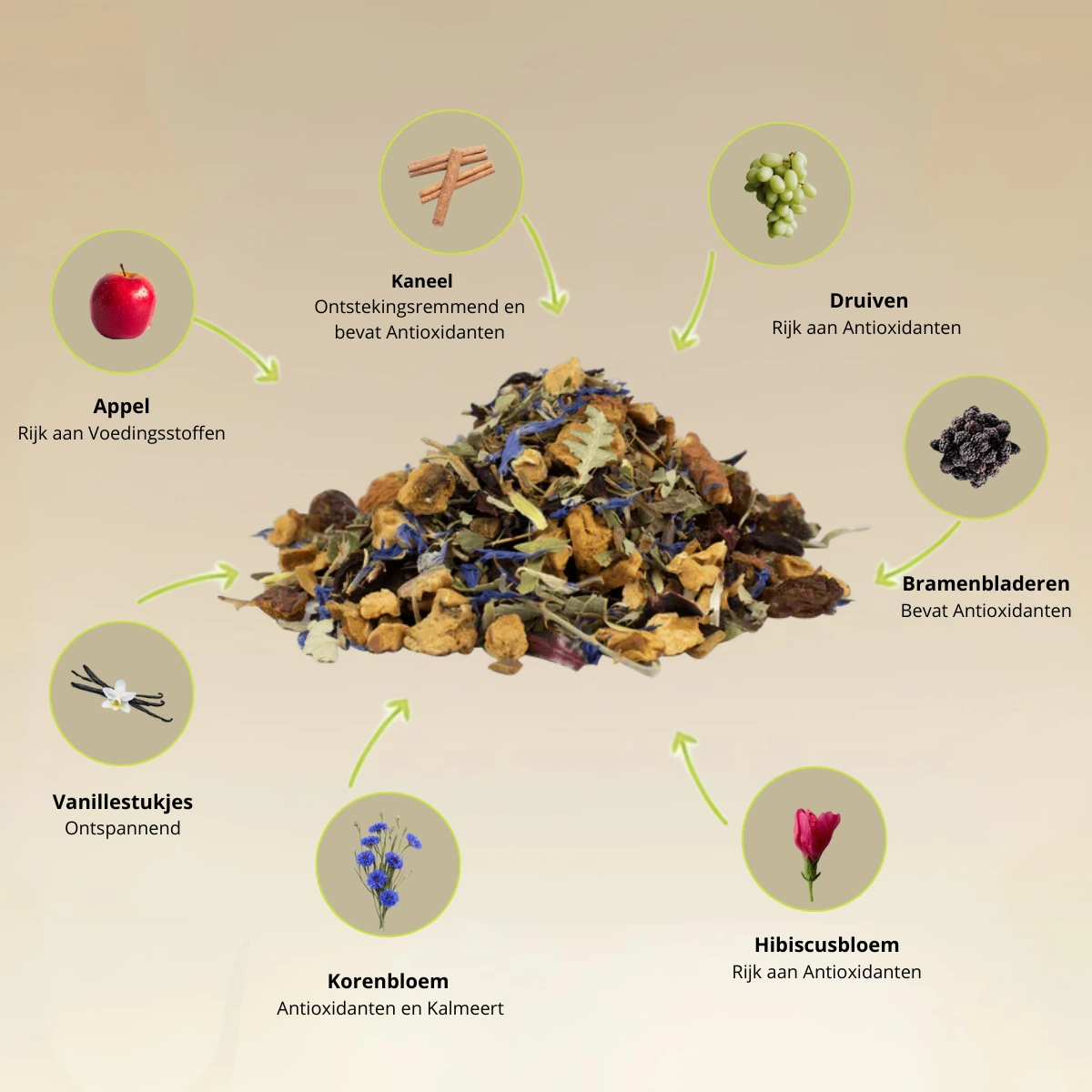 De Herfstappel Biologisch is meer dan een smaakvolle traktatie; het is een ervaring voor al je zintuigen. De dieprode kleur van de hibiscusbloesems en de elegante korenbloembloesems in de mix creëren een visueel spektakel, terwijl het natuurlijke bourbon-vanille aroma een rustgevende geur biedt. Elke slok neemt je mee op een reis door de rijke aroma’s en smaken van de herfst.