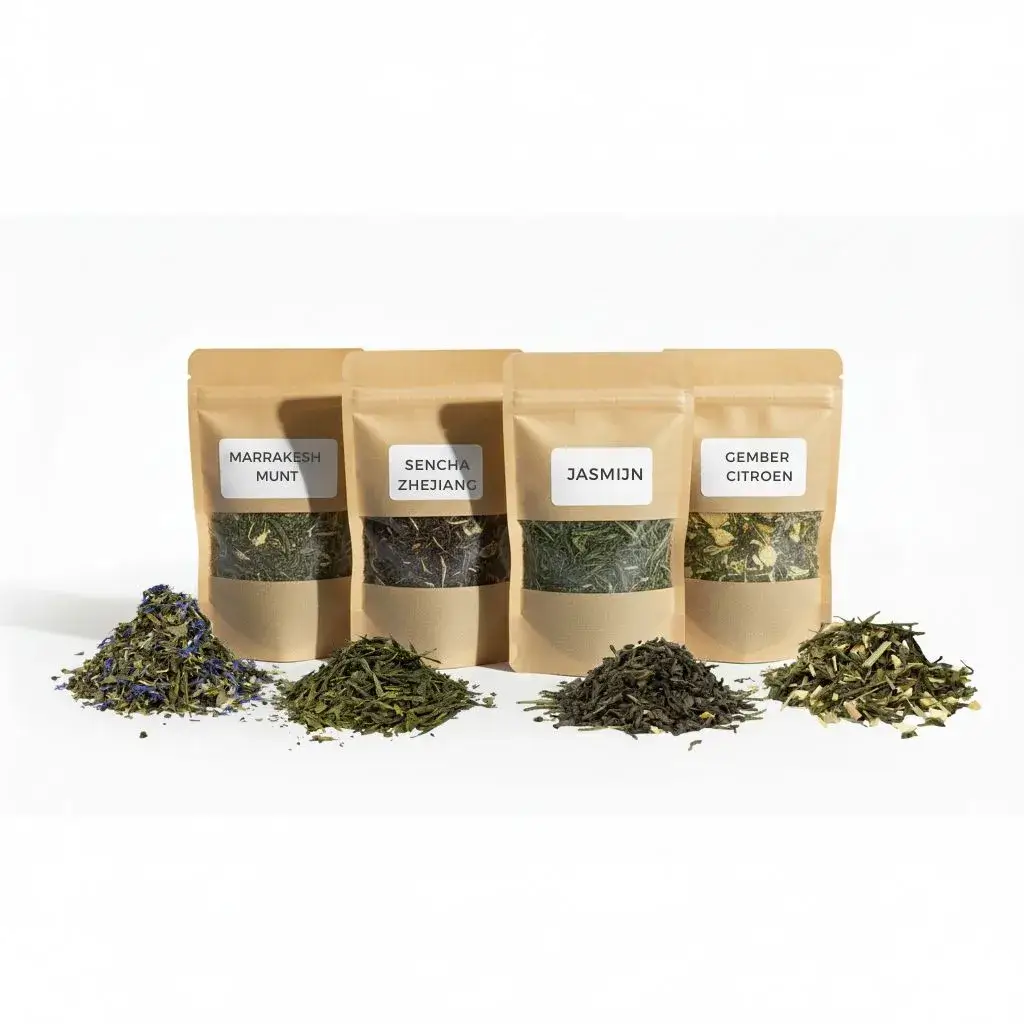 Elke thee in dit pakket is 100% biologisch en met zorg geselecteerd. Je ontvangt vier losse groene theesoorten in porties van 50 gram, allemaal samengesteld uit natuurlijke ingrediënten, zonder kunstmatige geur- of smaakstoffen. Hieronder lees je precies wat je kunt verwachten.