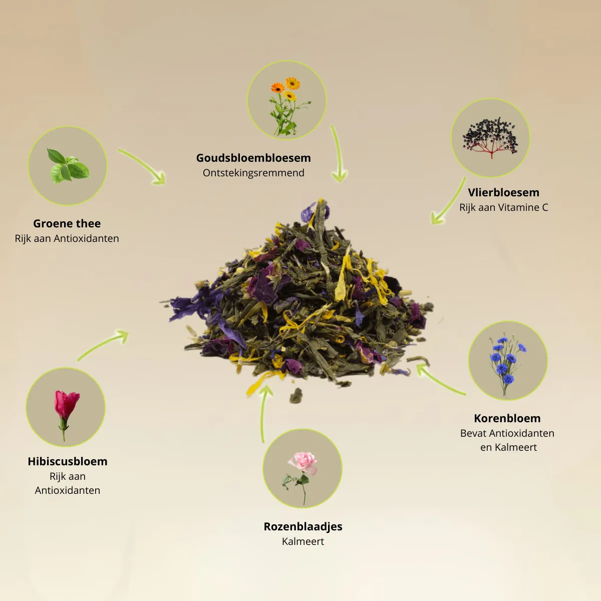 Ingrediënten: Groene thee Sencha* (China), groene thee Chun Mee* (China), goudsbloembloesem*, vlierbloesem*, korenbloemen*, natuurlijk vlierbloesemaroma, rozenblaadjes*, hibiscusbloemen*, natuurlijk rozenaroma. *van gecontroleerde biologische teelt.