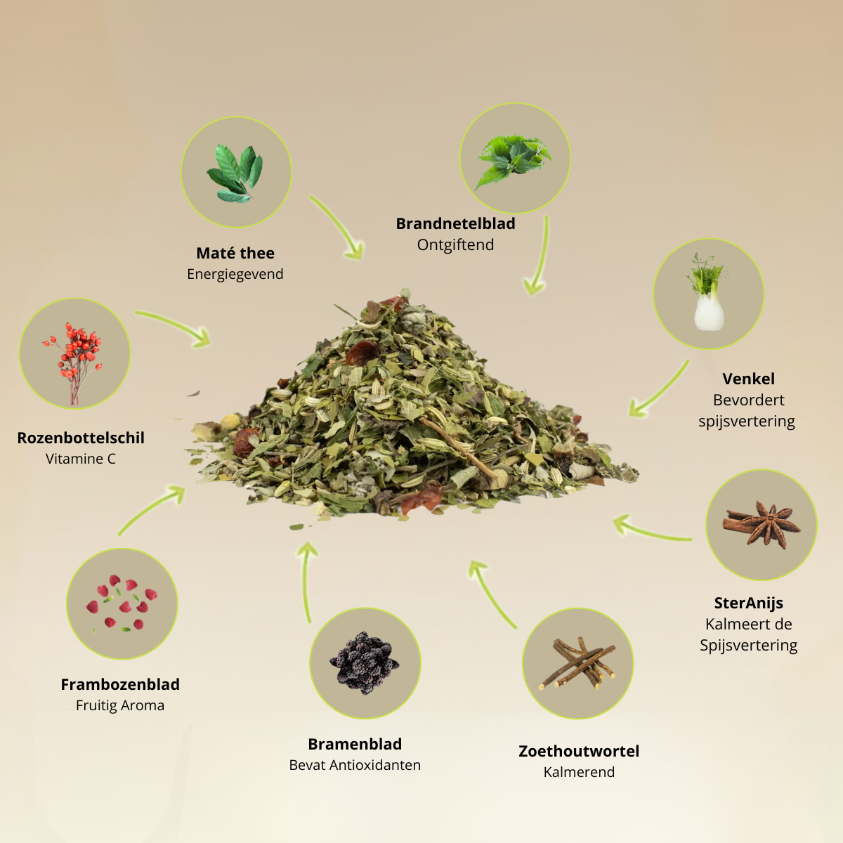 Ervaar de natuurlijke zuivering met onze Detox Kruidenthee Biologisch, een biologische melange van mate uit Brazilië, brandnetelblad, venkel, anijs, zoethoutwortel, bramenblad, frambozenblad en rozenbottelschil. Geef je lichaam de verfrissing die het verdient.