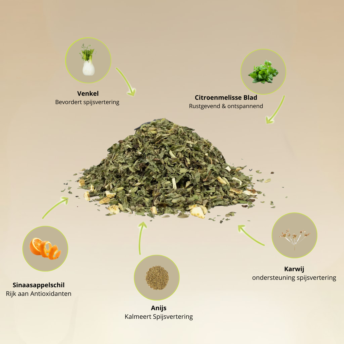Ingrediënten: venkel*, citroenmelisseblaadjes*, karwij*, anijs*, sinaasappelschil*. *gecertificeerd biologisch