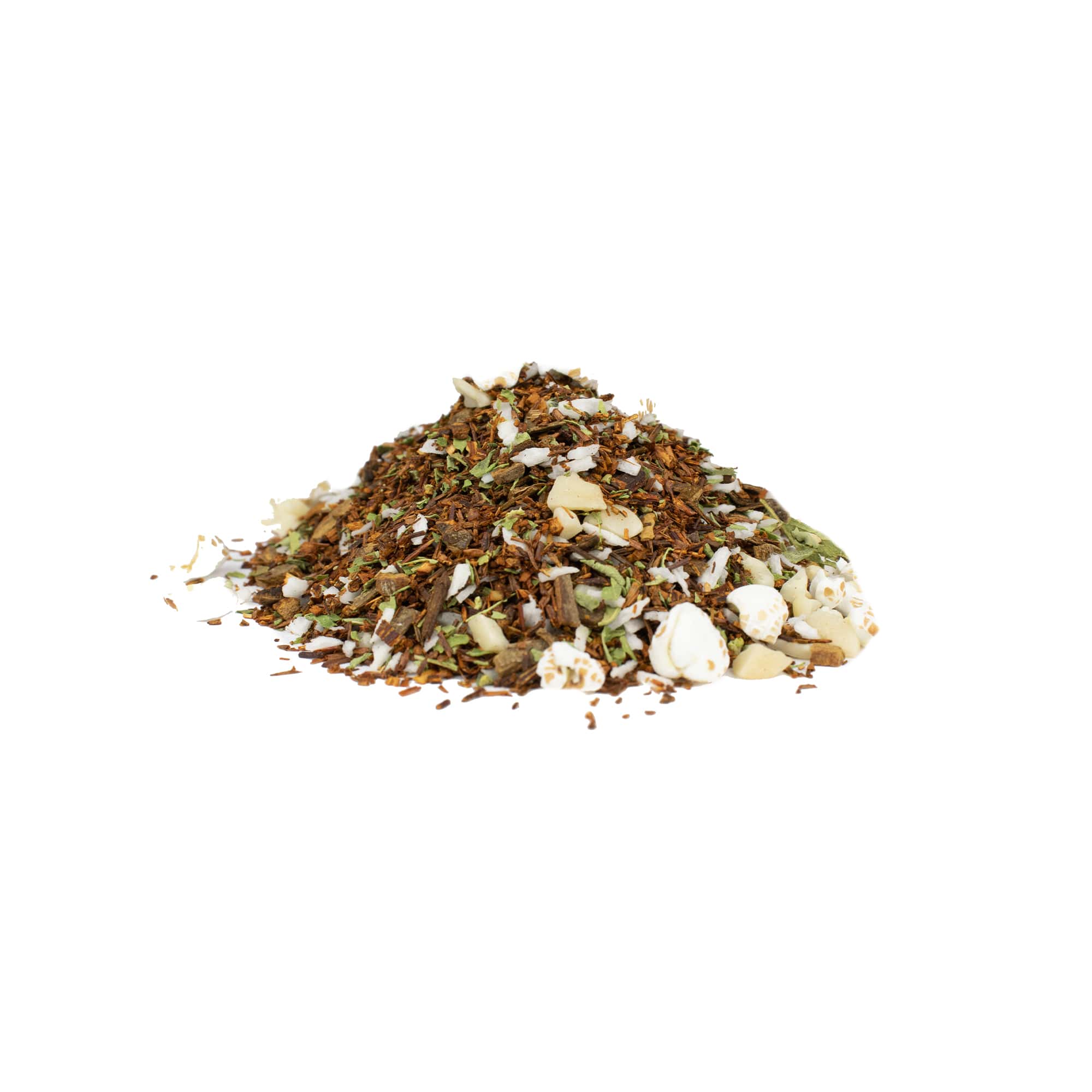 Onze biologische Amandel Kokos Rooibos thee is een unieke, smaakvolle thee-mengsel gemaakt van biologische ingrediënten. Rooibos thee is afkomstig uit Zuid-Afrika en wordt gemaakt van de bladeren van de Rooibos plant. Dit is een natuurlijk cafeïnevrij alternatief voor koffie en thee.