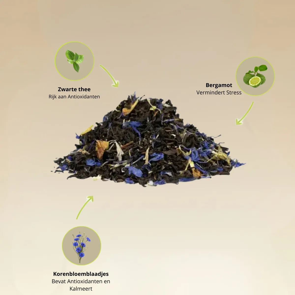 Ingrediënten: Zwarte thee melange* (China), zwarte thee Assam* (India), zwarte thee Darjeeling* (India), bergamotolie*, bergamotschil*, korenbloemblaadjes*. *van gecontroleerde biologische teelt