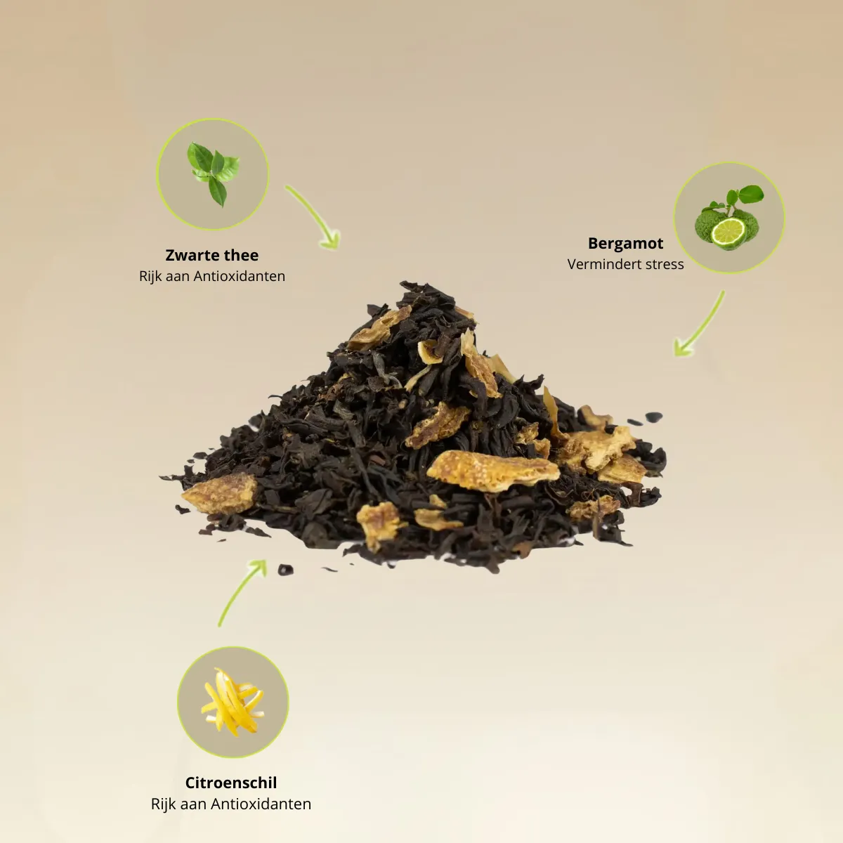 Elke kop is een blend van de fijnste zwarte Assam-thee uit India, gecombineerd met de natuurlijke frisheid van citroen- en bergamotolie, en afgewerkt met citroen- en bergamotschillen. Deze combinatie creëert een uniek aroma en een verfijnde smaak.